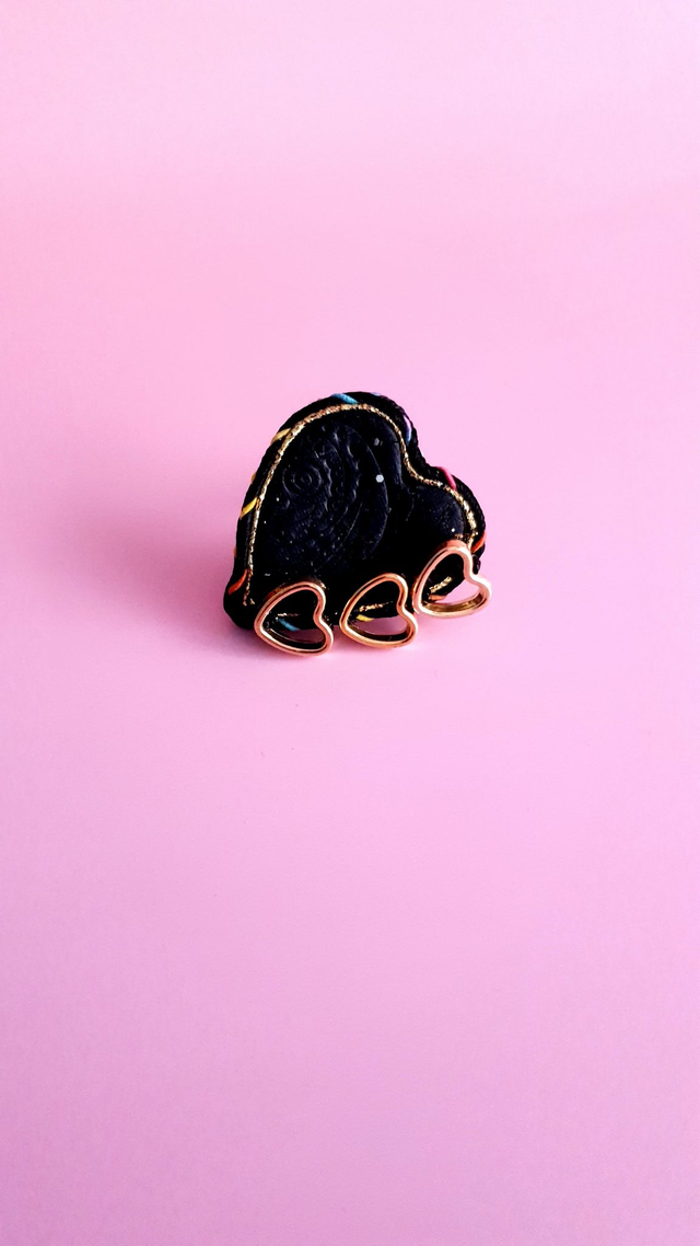 soutaches italiennes noir et dorée, cabochon en pâte polymère, coeur en métal doré